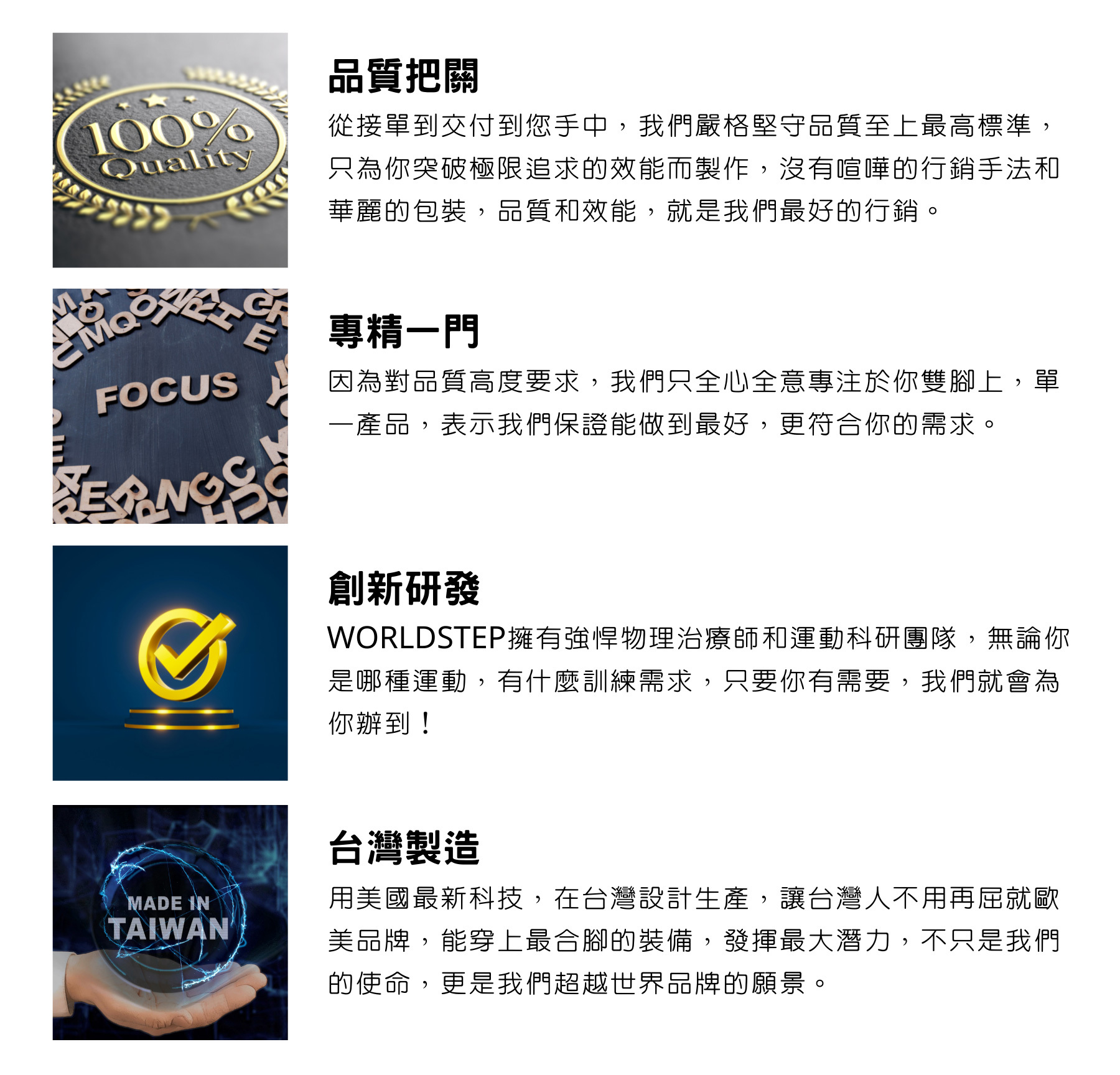 「WORLD」是我們給消費者的品質,持續引入世界頂尖運動科技商品,讓消費者能站在巨人肩膀上,突破和創造自己的紀錄。