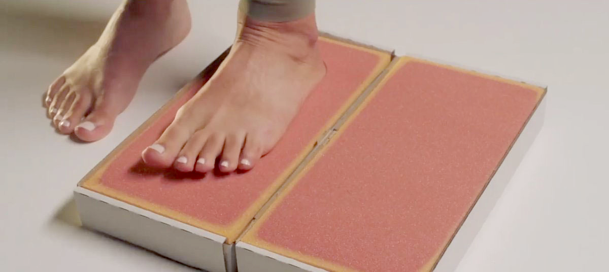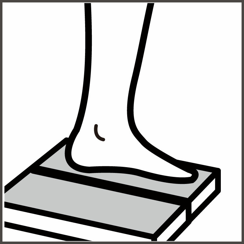 先將右腳輕放於左側海綿上,以垂直方向施力,讓整個腳掌平均踩踏到底,再將腳掌輕輕抬起,避免損壞模型。