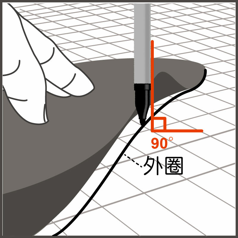 一隻手壓住鞋墊,一隻手拿簽字筆,筆尖垂直,描繪鞋墊外圍一周