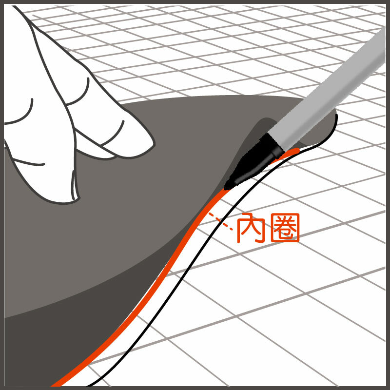 筆尖朝內,沿鞋墊足弓內側處,描繪鞋墊內圈一周,完成此步驟後,鞋墊會有外圈及內圈兩道描邊