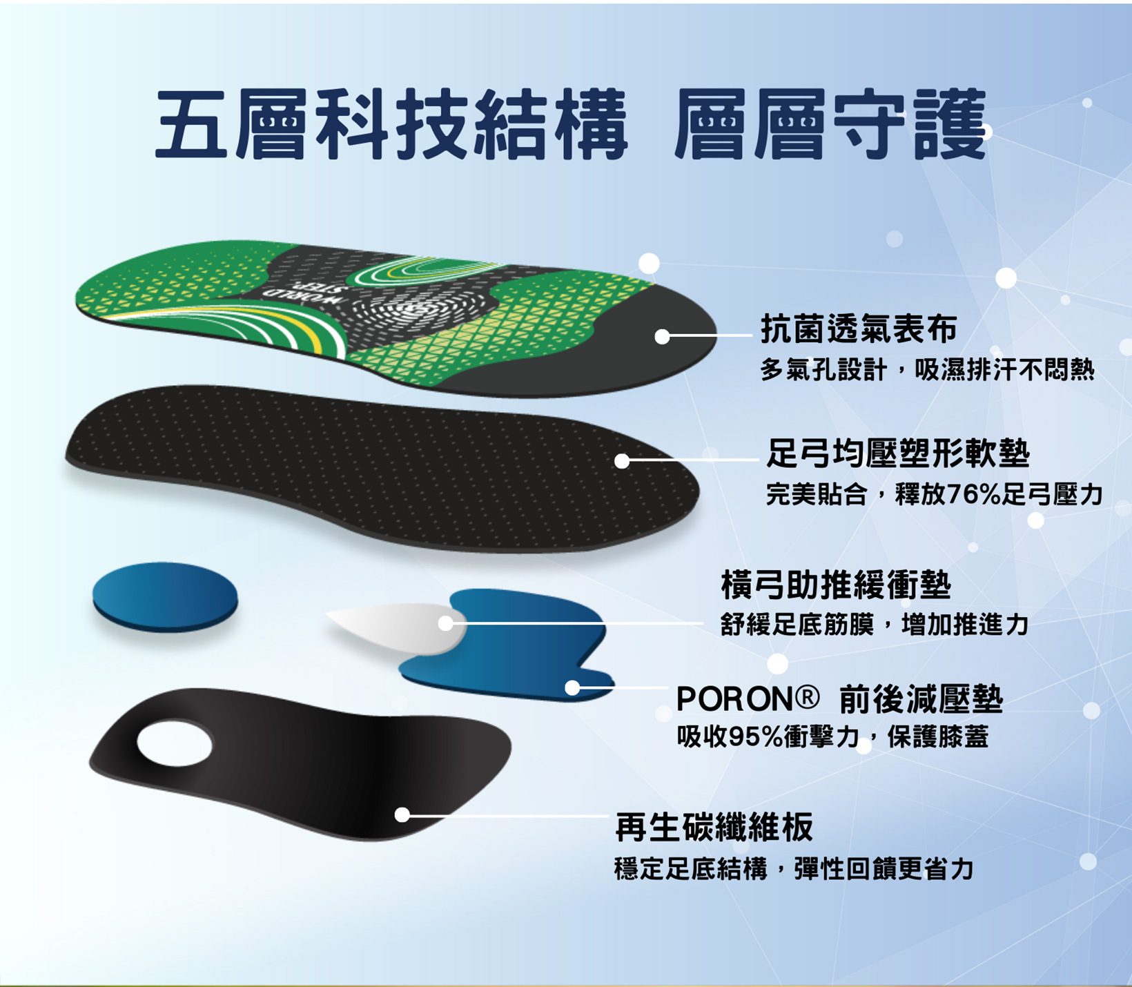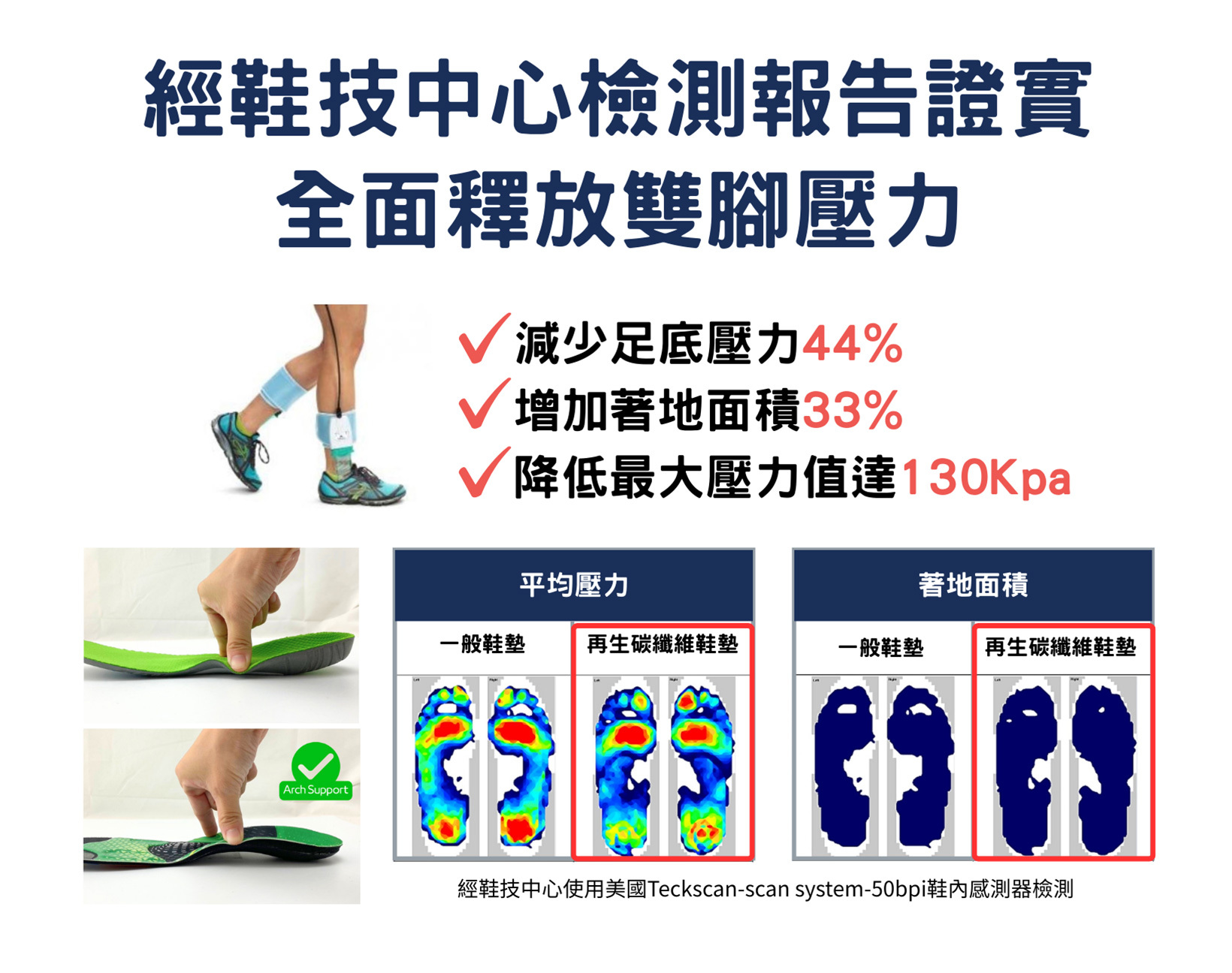 全新【再生碳纖維力學鞋墊】,採用環保再生材質製成,實踐綠色永續理念。