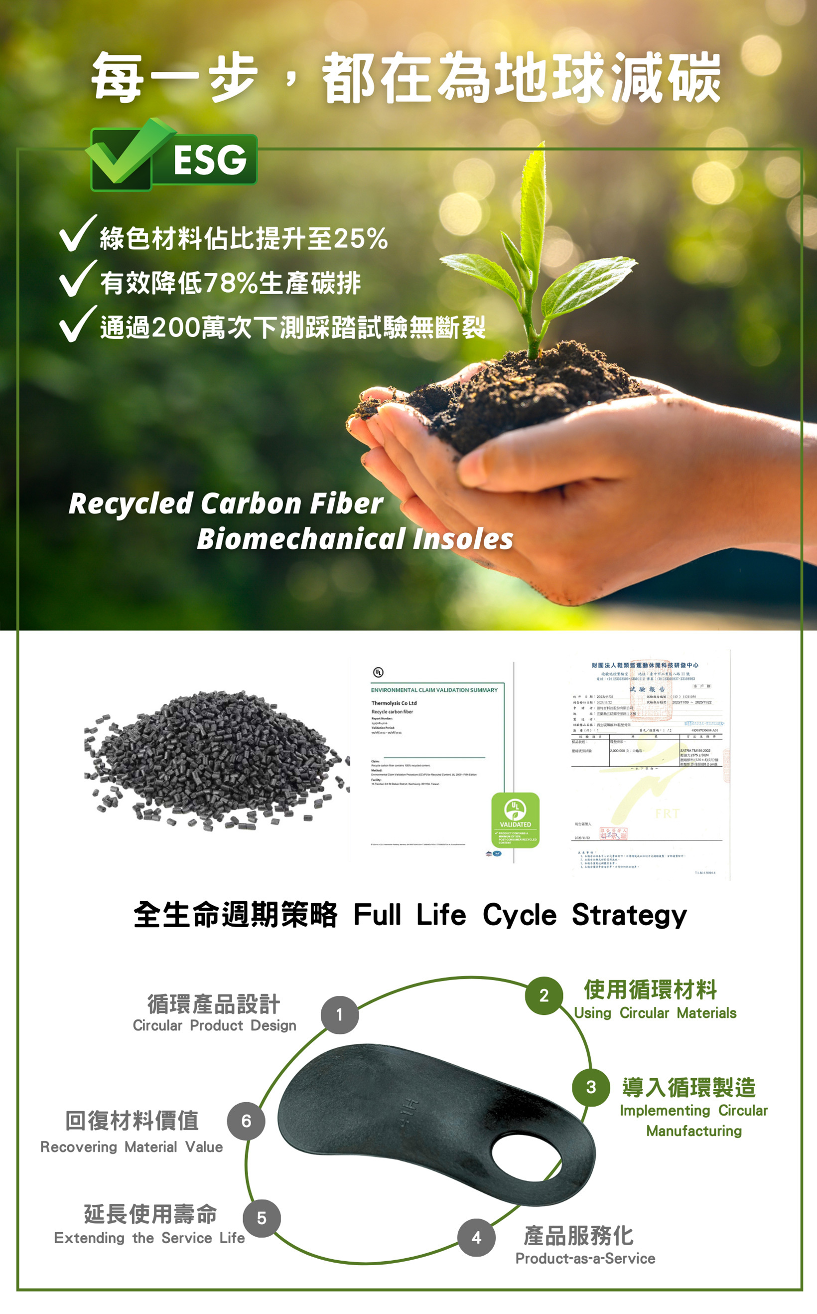 選擇【再生碳纖維力學鞋墊】,不只是呵護雙腳,更是對地球負責的一步。從日常生活開始,一步一腳印,邁向更綠色的未來。