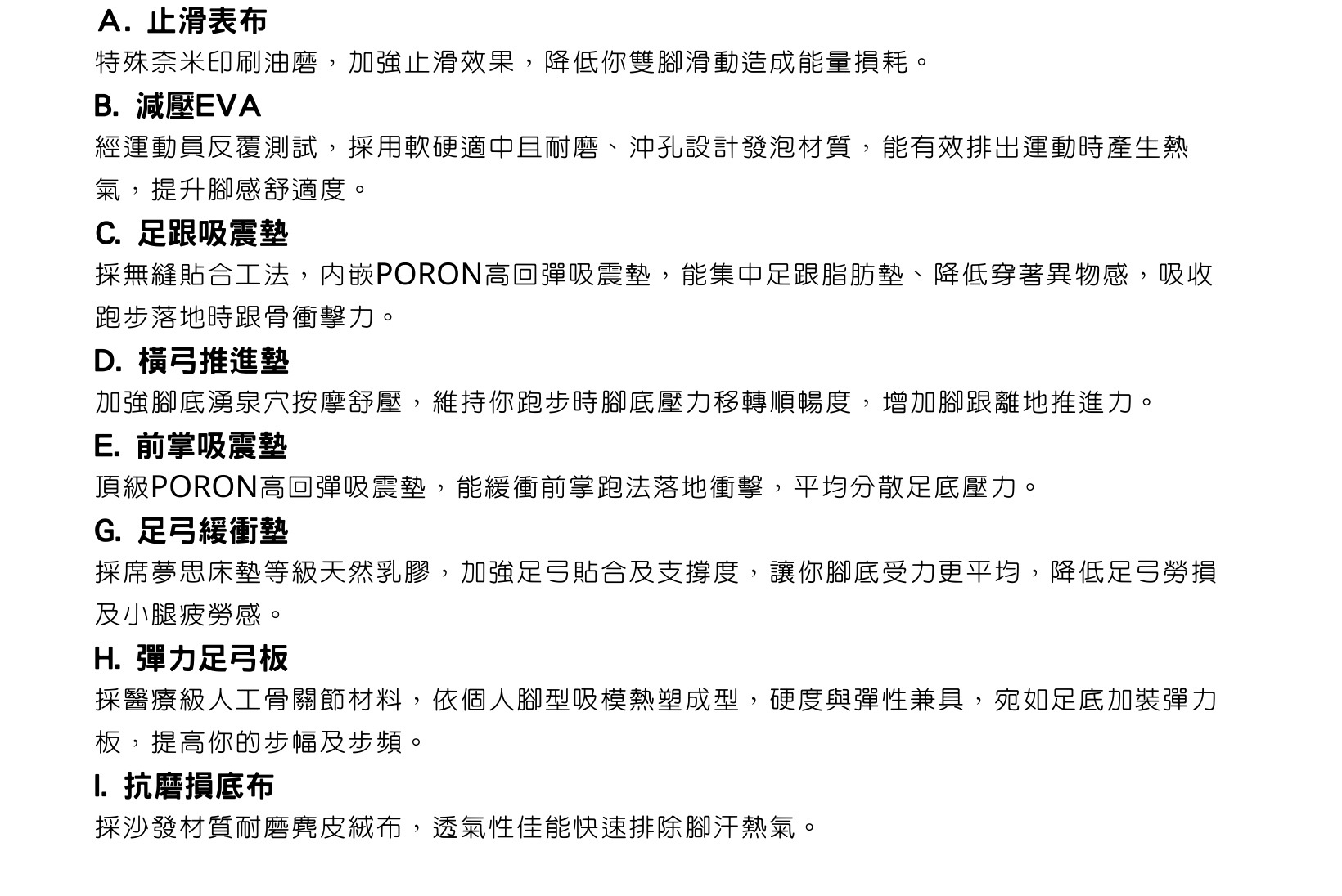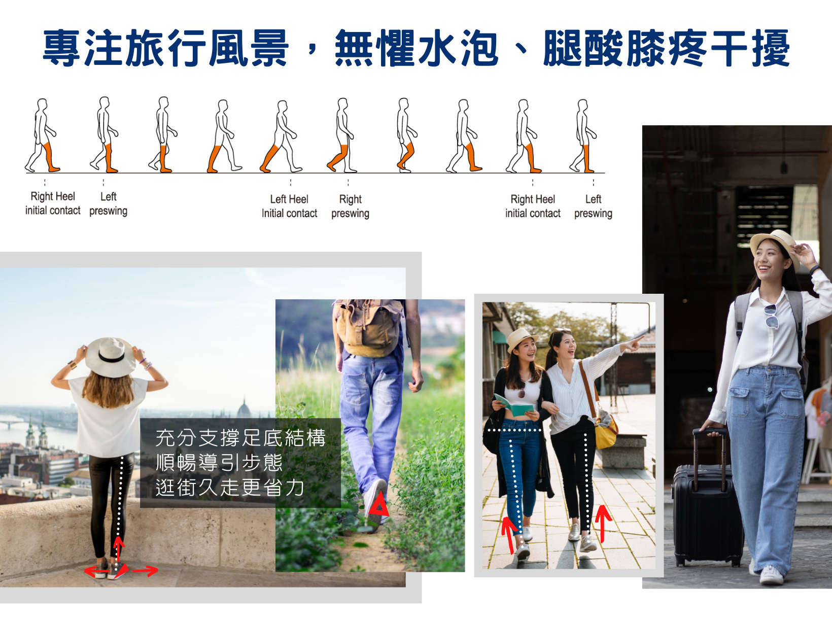 長效吸收雙腳累積之壓力,並提供良好緩衝與推進功能,讓您無論是旅行或上班,雙腳久站久走更省力!